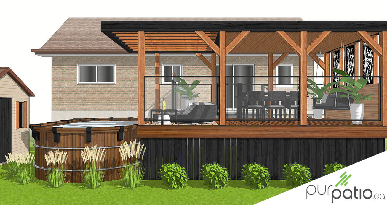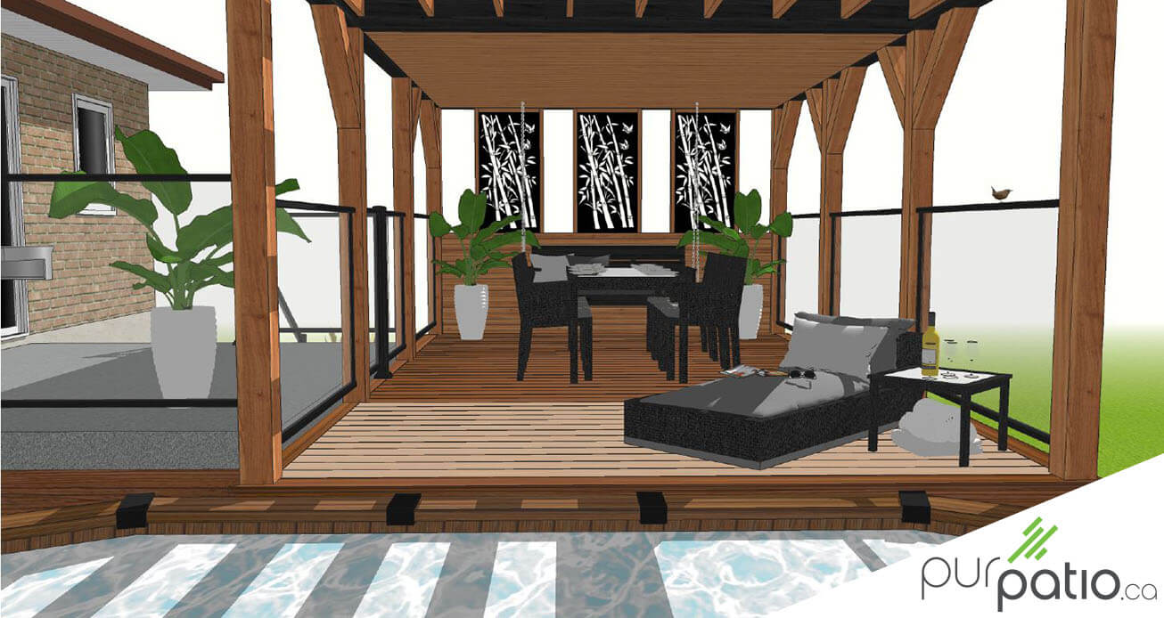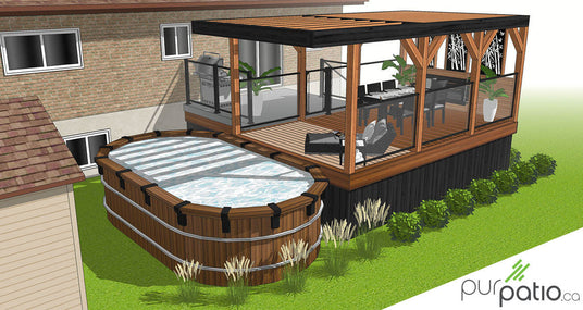 Le tout est couvert d’un gazebo au-dessus de la zone repas pour protéger du soleil et de la pluie. Il se transforme ensuite en pergola en porte-à-faux au-dessus de la zone piscine. Celle-ci permet donc de bloquer partiellement les rayons du soleil. Nous avons fait la structure en cèdre rouge de l’Ouest et nous l'avons encadrée d’un coté par un mur d’intimité hybride en cèdre avec panneau ajourés d’aluminium noir qui procure de l’intimité. Tous les autres côtés sont dotés de rampes Murano noires d’Aluminium Distinction. Elles comportent du verre afin de conserver la vue sur la cours. Les rampes d’une hauteur règlementaire ainsi que par la porte barrée à fermeture automatique assurent la sécurité de l'espace piscine.