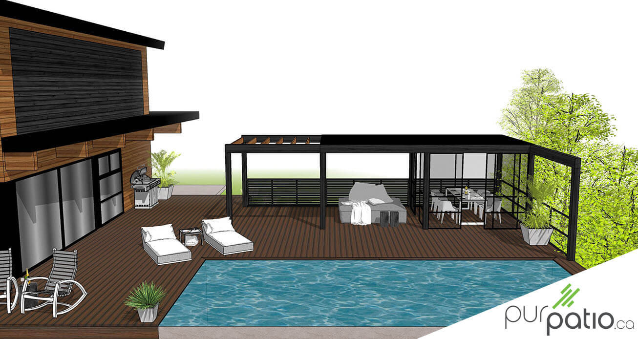 Ce design raffiné combine patio, pergola, gazebo et véranda dans un même espace harmonieux, offrant un lieu de détente luxueux au bord de la piscine