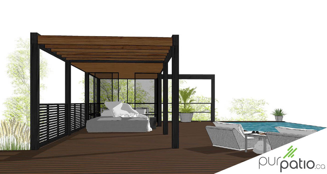 La première zone est couverte d’une pergola. Elle permet donc à ses occupants de se couvrir partiellement du soleil lorsqu’ils se détendent sur des chaises longues. La deuxième zone est agrémentée d’un lit extérieur et elle est couverte d’un gazebo. Elle protège complètement les gens qui y sont contre le soleil et la pluie. La dernière zone est celle qui abrite l’espace salle à manger dans une véranda. Celle-ci assure à ses occupants d’être à l’abri du soleil, de la pluie et des moustiques. Nous avons muni la structure de paravents mi-hauteur en barreaux horizontaux de cèdre Sélect teint, tout comme le reste de la conception.