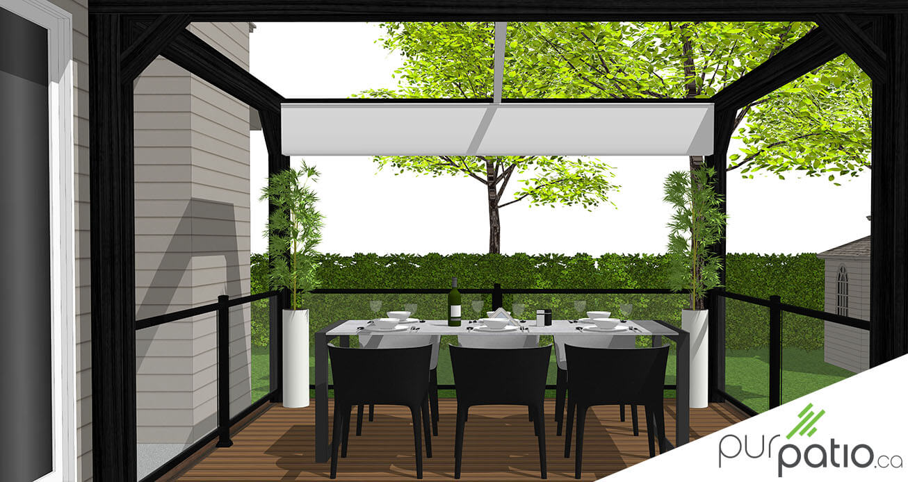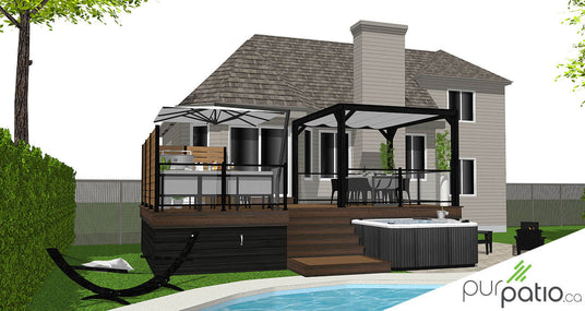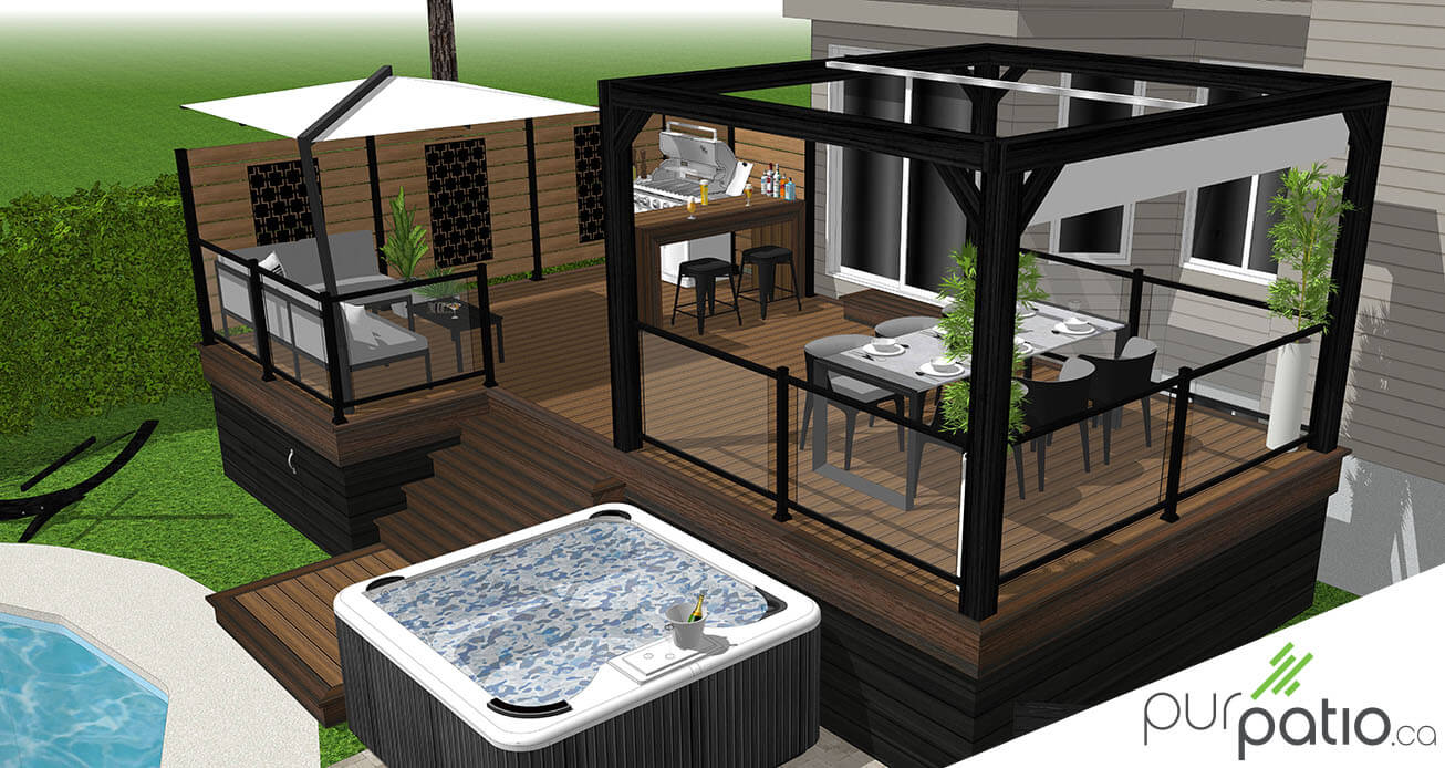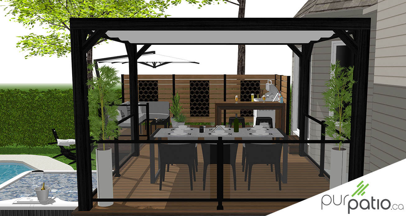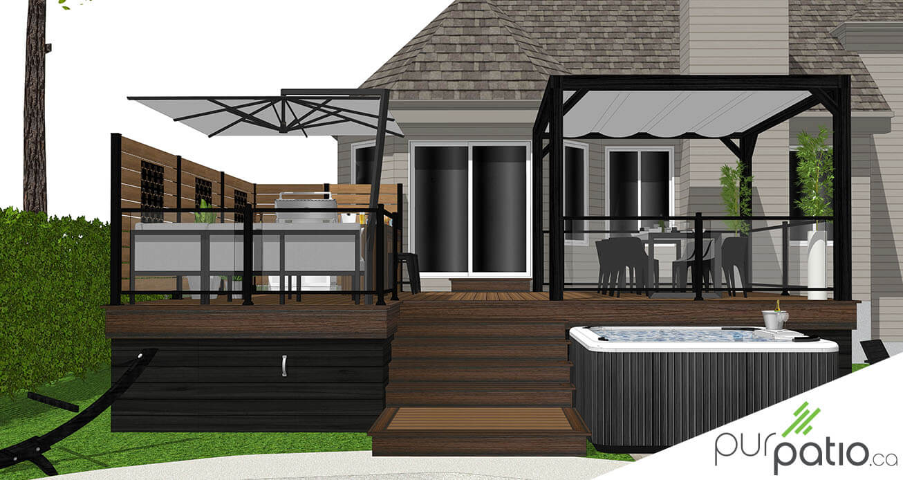 De l’autre côté du patio, nous avons installé la section repas sous une pergola moderne en cèdre rouge de l’Ouest. Nous l’avons teint Noir Onyx de Sansin pour contraster avec les couleurs de composite et donner un look actuel et intemporel à l’aménagement. Elle est munie d’une voile rétractable qui offre de l’ombre une fois déployée. Tout le périmètre est sécurisé avec des rampes en aluminium noir et en verre. Il s’agit du modèle Murano d’Aluminium Distinction. De plus, le spa est annexé à l’escalier afin d’avoir un accès facile et direct.