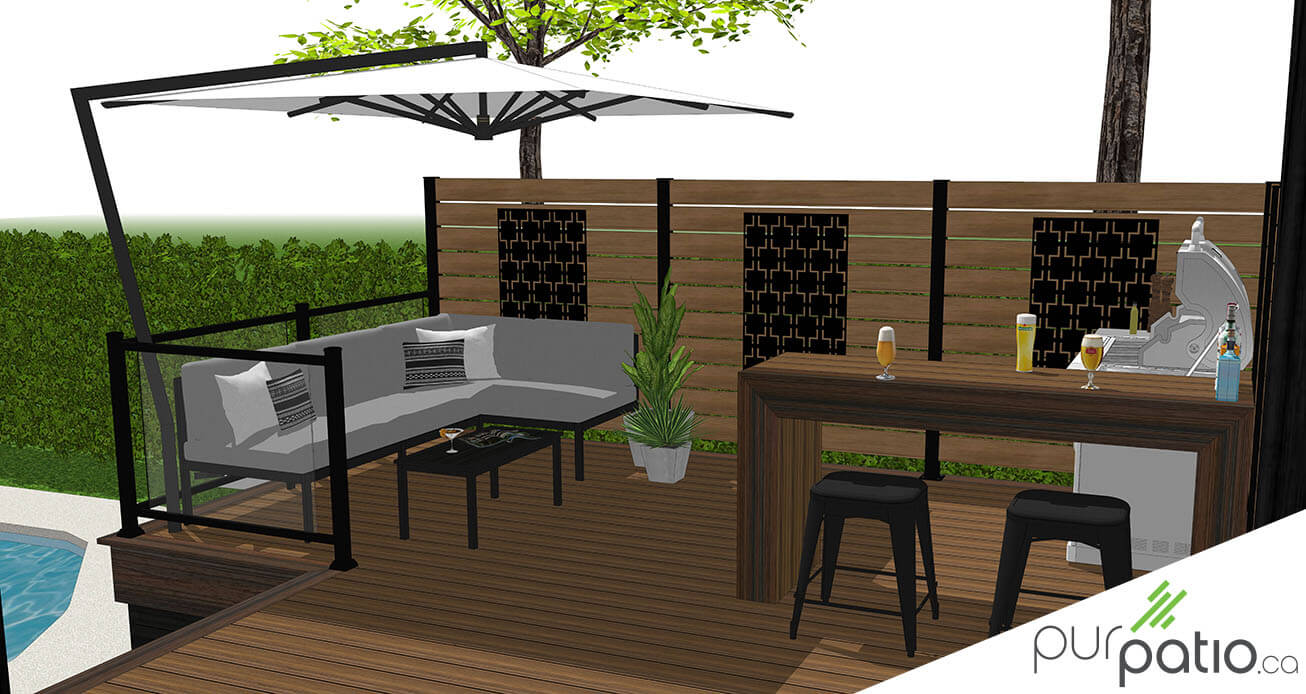 Sur cette plateforme, toutes les zones sont à proximité. D’un côté, on retrouve un espace pour le barbecue avec un comptoir bar en composite. Une section lounge y est également aménagée avec un parasol déporté qui offre un répit de soleil à ses occupants. Sur toute la longueur de ce côté, il y a un mur d’intimité en cèdre rouge de l’Ouest teint de couleur naturelle monté sur des poteaux en aluminium noir. Nous avons ajouté des découpes en acier galvanisé noir avec des motifs cubiques ajourés afin de créer un élément décoratif.