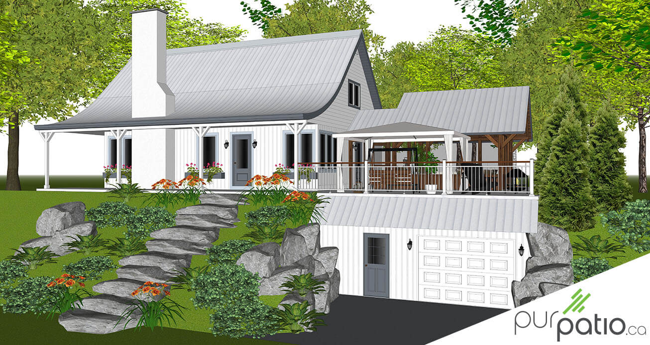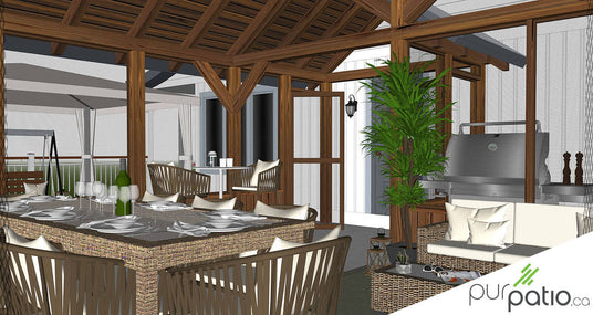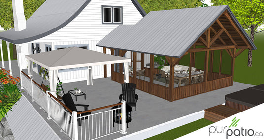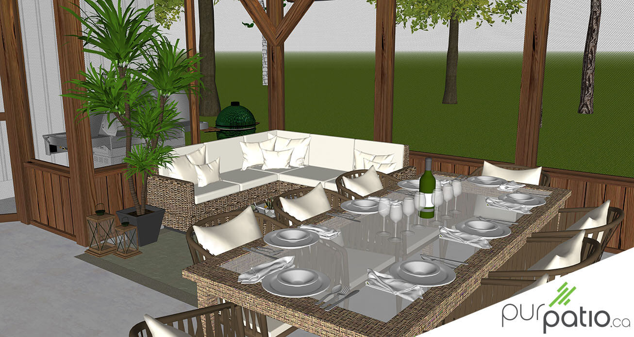 Ce design répond à la demande des clients qui désiraient avoir une véranda en timberframe pour y installer leur salle à manger extérieure ainsi qu’une aire de détente. Le but était d’avoir un prolongement de leur maison vers l’extérieur. Ils voulaient profiter de l’été à l’abri du soleil, de la pluie et des moustiques. En plus, ils disposaient déjà d’une grande surface en béton où l’on pouvait aménager cette future véranda.