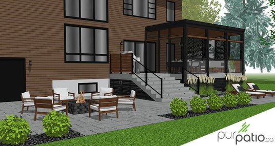 De plus, nous avons intégré un rangement sous le patio. Il y a des portes doubles dans la jupe situées de chaque côté. Elle est en cèdre rouge de l’Ouest teint Noir Onyx. Ses planches à plusieurs largeurs lui donne un look moderne. Ensuite, nous avons positionné des luminaires suspendus au plafond de la véranda ainsi que des lumières d’ambiance dans les contremarches. Finalement, la grande zone pavée au sol permet d’y installer une section détente avec chaises longues ainsi qu’une section feu avec plusieurs places assises. Il s’agit donc d’un aménagement de rêve qui leur donnera envie de passer l’été dans leur cour!