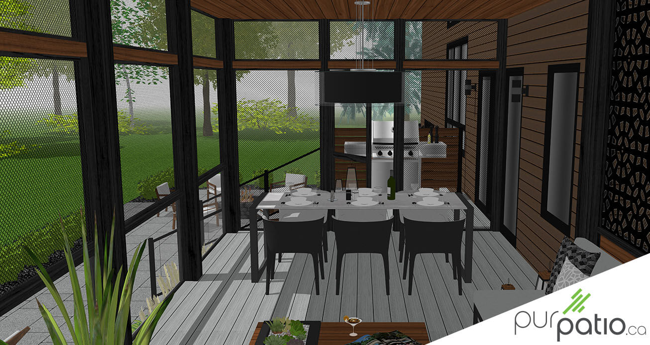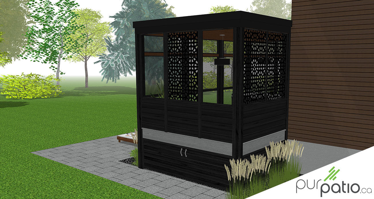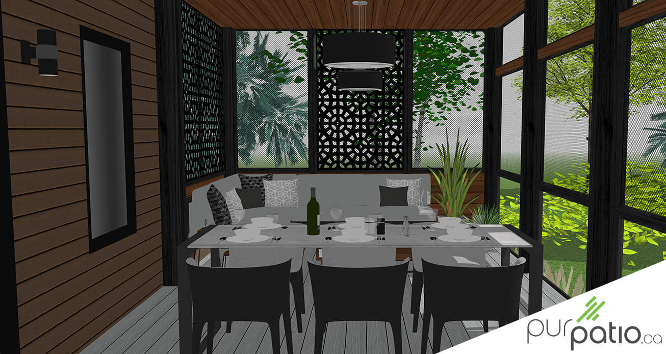 La véranda se marie bien à la maison avec ses formes droites et rectilignes. Un timberframe de pin blanc plané teint Noir Onyx et Espresso de Sansin la compose. Les rambardes sont des murets en lambris du côté avant et latéral. À l'arrière il s'agit de vitres afin de dégager la vue vers la cour. La véranda a également une porte-moustiquaire qui donne accès facilement à la zone barbecue. Nous avons ajouté des impostes en pin et des découpes en acier galvanisé noir avec des motifs géométriques afin de donner du caractère à la structure et pour dynamiser le design. Le plafond est en planches de cèdre rouge de l’Ouest également teint Espresso et le toit de la véranda est plat. Des moustiquaires ferment soigneusement les espaces restants afin que les occupants ne soient pas un buffet à volonté pour les moustiques.
