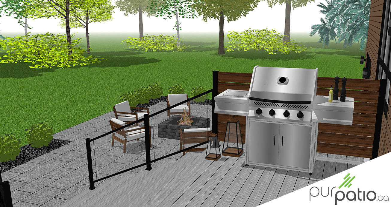 Ce jeune couple nous a demandé de leur concevoir un aménagement extérieur avec une véranda moderne qui s’agencerait à leur nouvelle demeure. Nous avons donc fait un patio en composite Trex Transcend couleur Gravel Path. Ainsi, nous pouvons positionner la véranda et la section barbecue à la sortie de la maison. Une des deux ouvertures de la porte-patio donne directement dans la véranda, tandis que l’autre mène à l’extérieur. Derrière le barbecue, nous avons mis un paravent. Il est en cèdre rouge de l’Ouest teint Espresso de Sansin et monté sur des poteaux en aluminium noir.