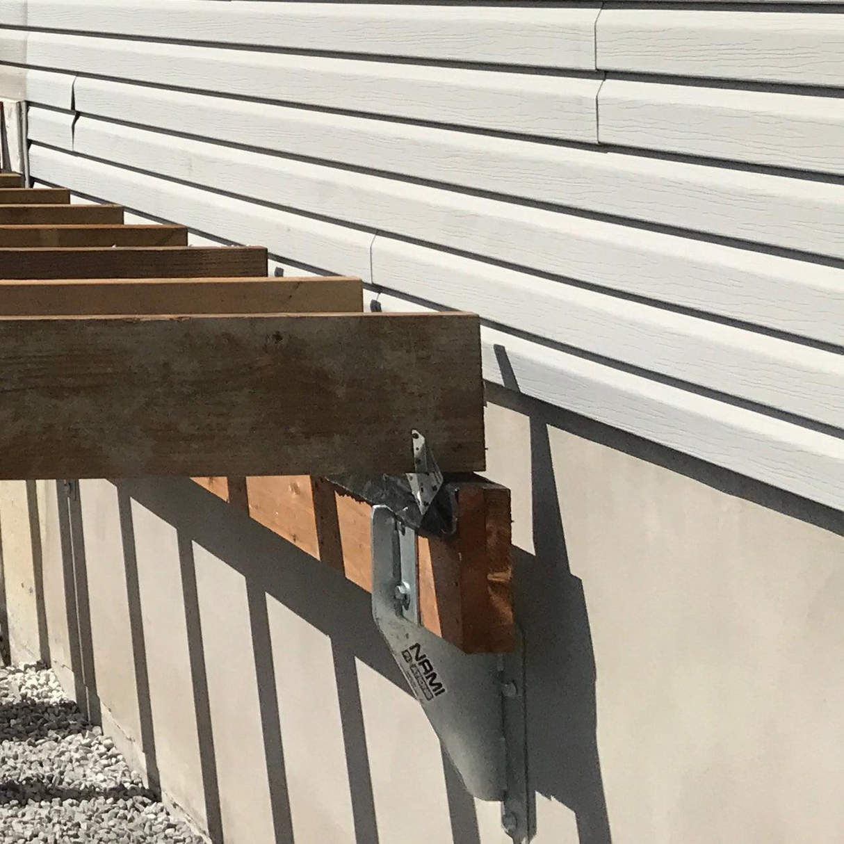 The N2 patio support from Nami Fixations serves as an anchoring system for a patio whose beams are parallel to the foundation of the house.