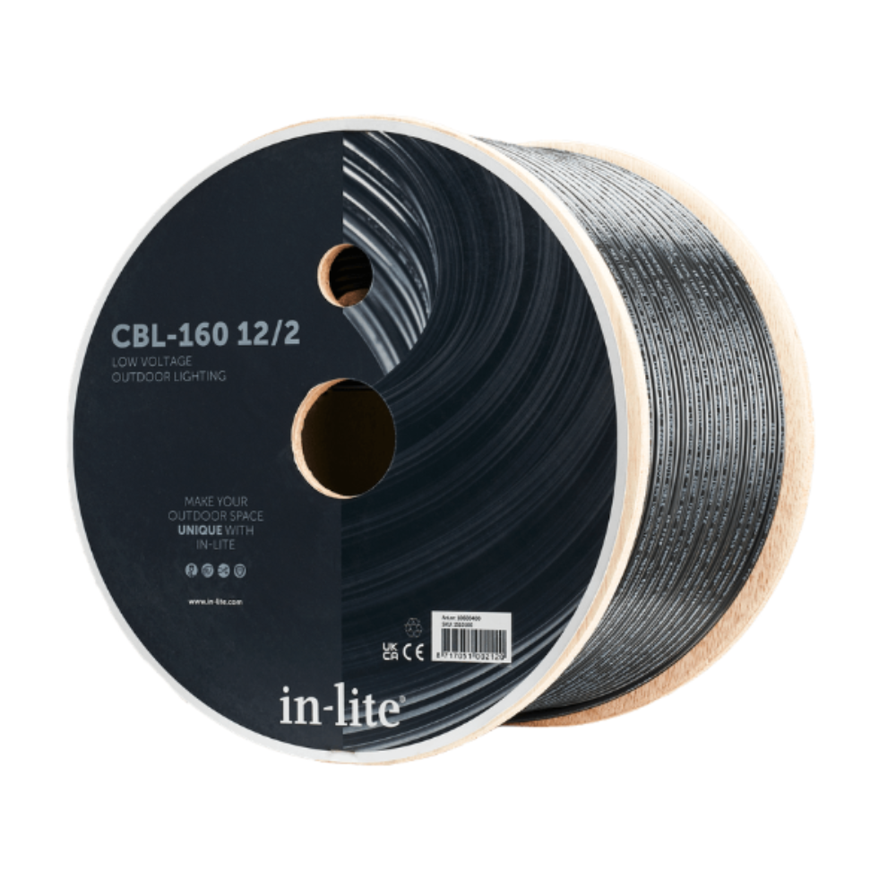 in-lite- CBL-160 12/2 est un câble basse tension de type 12/2 12 volts 2 conducteurs, d'une longueur de 160 mètres. Le câble CBL-160 12/2 de 160 mètres peut supporter une charge maximale de 250 watts.
